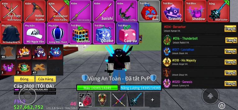 Tất cả acc đều đăng nhập đổi mật khẩu ngay, cam kết nick sạch – không khóa – không gian lận, hỗ trợ nhiệt tình nếu phát sinh vấn đề. Shop luôn cập nhật acc mới mỗi ngày, đảm bảo uy tín – an toàn – tiện lợi cho khách hàng mua acc Blox Fruits.