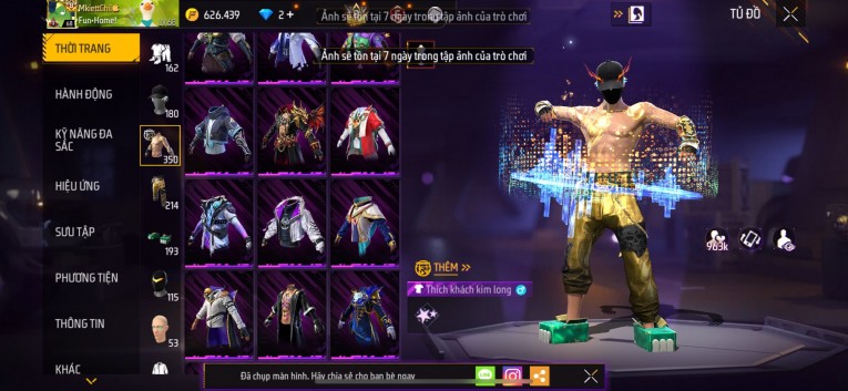 Acc chơi lâu, nhiều skin súng xịn, đầy đủ áo và phụ kiện nam. Đồ đủ dùng, đẹp mắt – vào chơi là chiến ngay! Phù hợp anh em thích skin đẹp, súng mạnh, acc ổn định.